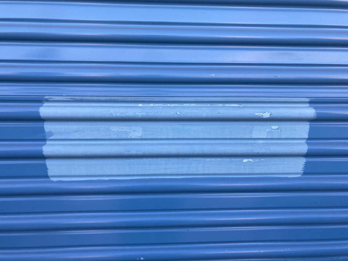- Faded, oxidized roll-up doors